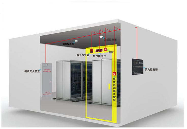 机房消防系统一般由火灾报警探测器、报警控制器、紧急启停按钮、声光报警器、警铃、放气指示灯、连接线路等组成。系统应具有自动报警、人工报警、自动及手动启动气体灭火装置等功能。